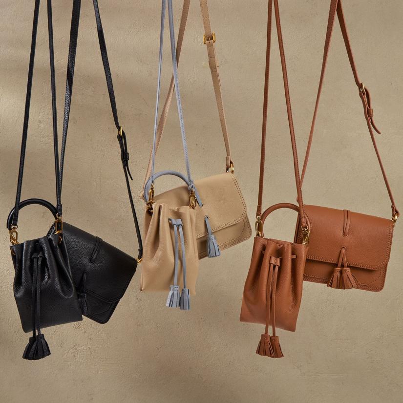 The blue pearl tassel and wrapped handle detailing add cool charm to the neutral pebbled leather. Carry as a crossbody or a top handle bag – depending on your mood and outfit, of course. A simple pull of the tassel cinches your bag closed so your phone is safe, but within reach.