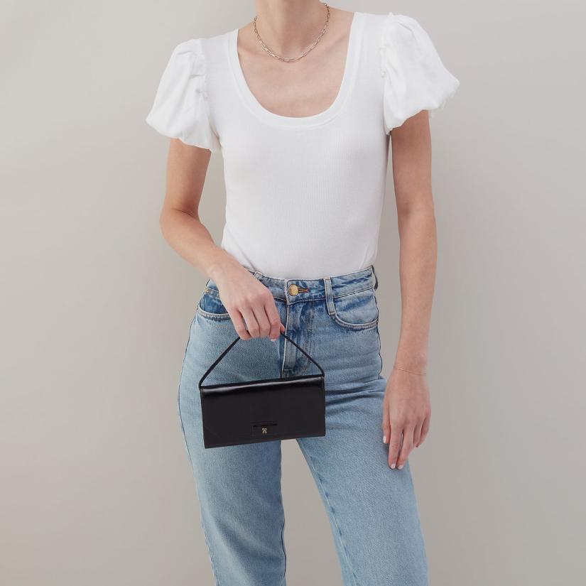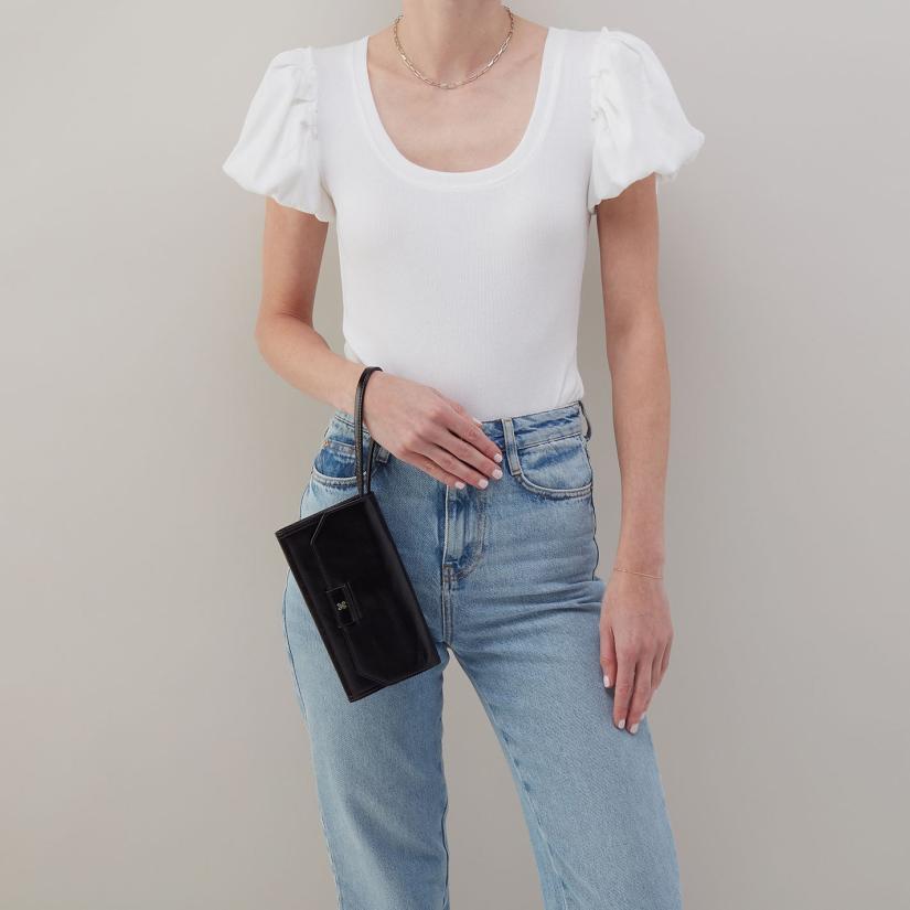 - The convertible strap allows you to wear as a wristlet, short shoulder, or crossbody